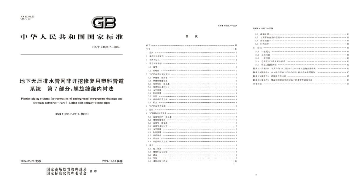 五行諾道參編國標《地下無壓排水管網非開挖修復用塑料管道系統第7部分:螺旋纏繞內襯法》GB/T 41666.7-2024 正式發布